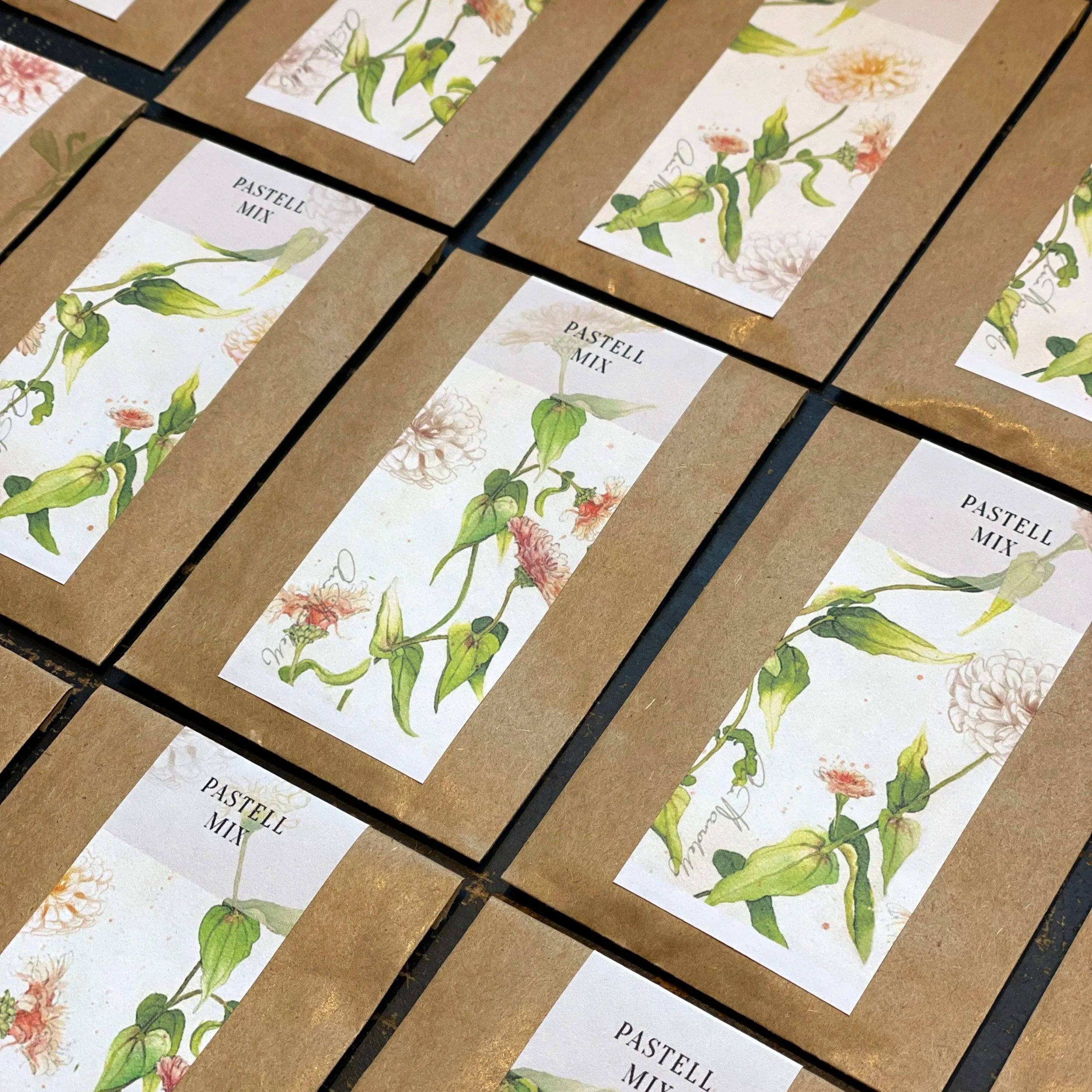 Skapa dina egna fina fröpåsar och ladda ner den här mallen. Skriv ut fröpåsarna på vanligt A4-papper eller ett finare med struktur med samma mått. Klipp ut, vik och tejpa ihop fröpåsarna på baksidan.
